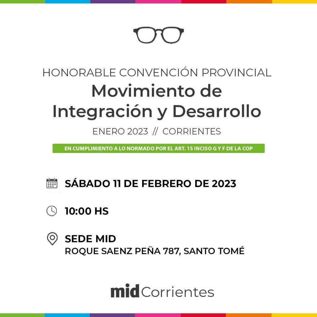 El Movimiento de Integración y Desarrollo (MID) convoca a todos sus afiliados e interesados a participar en la reunión extraordinaria de la Honorable Convención Provincial partidaria, que se realizará el sábado 11 de febrero de 2023, a partir de las 10.00, en la sede del MID de la ciudad de Santo Tomé, ubicada en calle Roque Sáenz Peña 787.