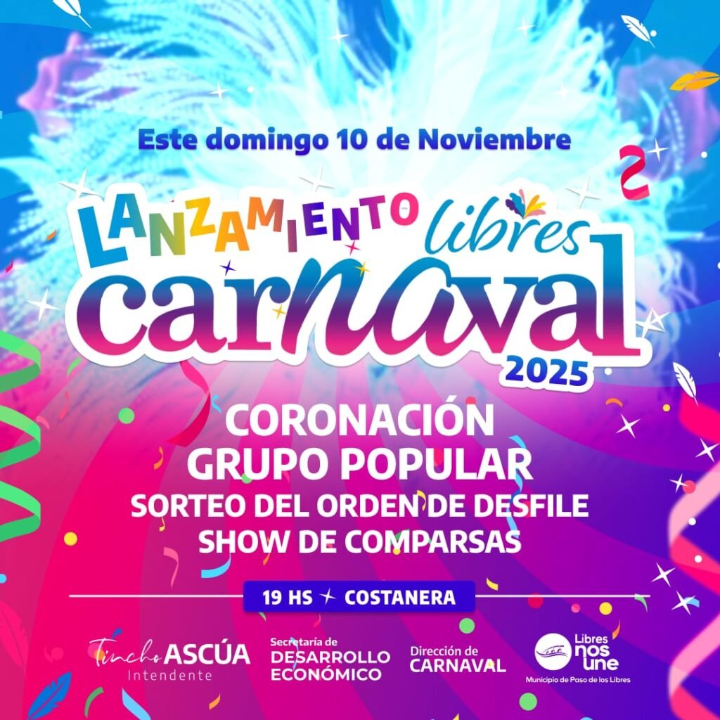 Este domingo 10 de noviembre, la ciudad de Paso de los Libres celebrará el esperado lanzamiento del Carnaval 2025. El evento, que se realizará en la costanera a partir de las 19, promete una noche llena de actividades para los amantes del carnaval libreño.