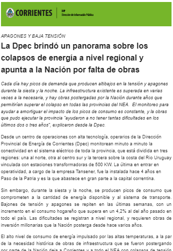 Cada día hay picos de demanda que producen altibajos en la tensión y apagones durante la siesta y la noche. La infraestructura existente es superada en varias veces a la necesaria, y hay obras postergadas por la Nación durante años que permitirían superar el colapso en todas las provincias del NEA.  El monitoreo para ayudar a amortiguar el impacto de los picos de consumo es constante, y la obras que pudo ejecutar la provincia “ayudaron a no tener tantas dificultades en los últimos dos o tres años”, explicaron desde la Dpec.